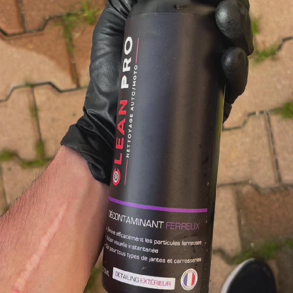 Décontaminant ferreux : pulvérisez sur jantes sèches, laissez agir 2 à 5 minutes, jusqu’à ce que le produit vire au violet (réaction avec les particules métalliques).